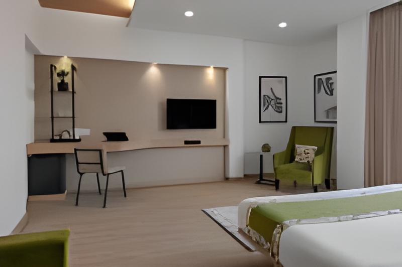 Elegant room with a king-sized bed and city views, ideal for business travelers or couples.